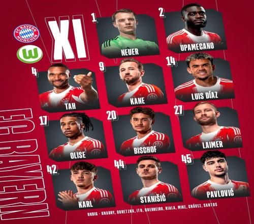 北京时间1月12日凌晨00:30,拜仁将迎来德甲第16轮主场对阵沃尔夫斯堡的比赛,目前,双方的首发阵容和替补名单已经...