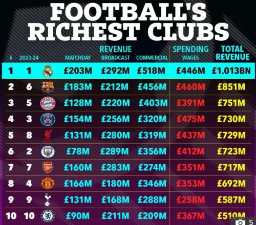 最新德勤足坛财富榜已经发布,皇萨仁排在前三,曼联跌至第八,利物浦升至第五名,英超俱乐部在前三十名占据了半壁江...
