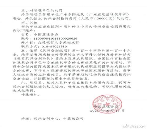 中国篮协:吉伦沃特兴奋剂违规禁赛3个月广东男篮承担3万6检测费