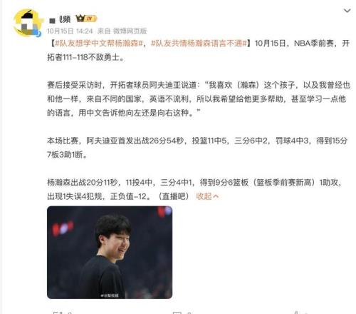 除此之外,在带领球队结束了对阵勇士的第二场比赛之后,阿夫迪亚在赛后的采访中盛赞杨瀚森,直言自己非常喜欢这名年轻球员。在他的身上看到了自己刚刚来到NBA发展时候的状态,非常的努力刻苦,而且非常的谦逊。所以为了能够更快让这一位小老弟适应在这边的工作,阿夫迪亚主动学习中文,学习一些简单的词汇,未来想要在场上用中文和他进行沟通挡拆。一方面这样能够减少杨瀚森的压力,让双方配合起来更加的顺畅。另外一方面也可以形成一种加密语言,因为国外的球员都听不懂中文。