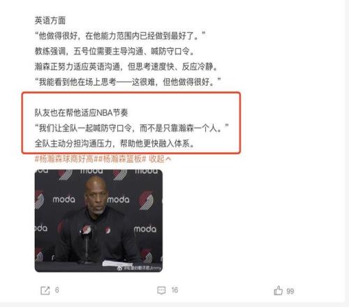 从最近半年的表现来看,我们当然不担心杨瀚森内向的问题,因为他的性格非常的活泼外向,平时在球队也会主动和教练以及队友们搭话,包括和老大哥之间的相处也非常的愉快。除此之外,在最近三场季前赛比赛结束之后,我们又得知了一些非常好的消息,杨瀚森在开拓者这边也是有大哥罩着的。