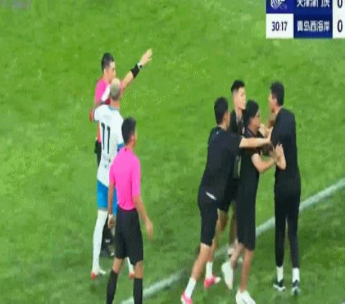 接着36岁的老将张呈栋也因不满判罚,连续怒喷边裁和当值主裁,甚至连外援队友都拉不住,结果也是吃到第2张黄牌,在半场结束前被罚下。