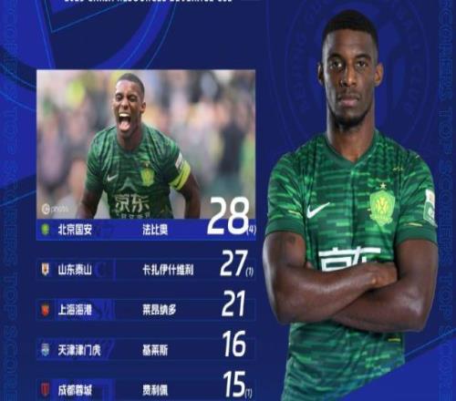 北京国安的射手法比奥前14轮过后,只打进8个进球,第15轮面对弱旅梅州客家,他上演帽子戏法,以11球领先基莱斯一球的优势,拿下半程射手王。