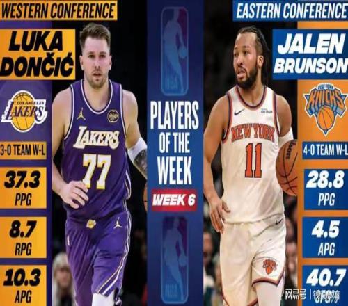 NBA官方公布第6周东西部周最佳球员,东部荣誉归属尼克斯后卫布伦森,他上周场均贡献28.8分+4.5助攻,带领球队豪取4胜0负的全胜战绩,这也是其生涯第8次斩获周最佳;西部则由湖人后卫东契奇当选,他上周状态暴走,场均轰下37.3分+8.7篮板+10.3助攻的豪华数据,助力湖人取得3胜0负,职业生涯第15次获此荣誉。此外,贝恩、布朗、希罗、西亚卡姆、里夫斯等多位球星入围本期周最佳提名名单。