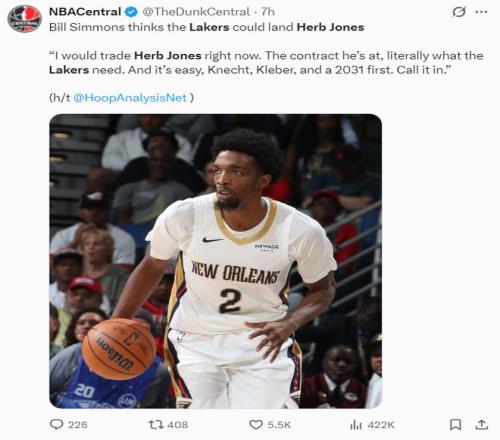湖人媒体laker Tom为湖人模拟了一套大交易方案,他认为湖人不该只交易赫伯特-琼斯一人,湖人应该借此机会扩大交易进行超级补强。