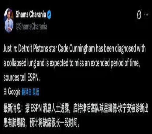 活塞当家持球大核坎宁安被诊断出患有气胸,预计将缺席很长一段时间(an extended period of time)。