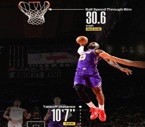 最后说一个冷知识,在此前19日对阵火箭的比赛中,詹姆斯有一个远距离扣篮,距离篮筐10英尺7英寸,大概为3.2米,是本赛季第三远距离扣篮,可见詹姆斯身体天赋逆天到何等地步。
